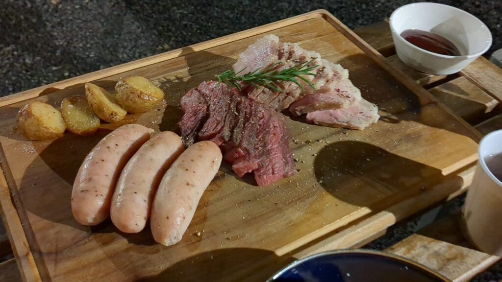 鉄鍋で焼いたジューシーなお肉を頬張り、夜の校庭で過ごす時間は、まさに至福のひととき。