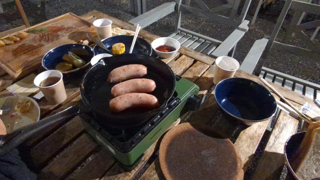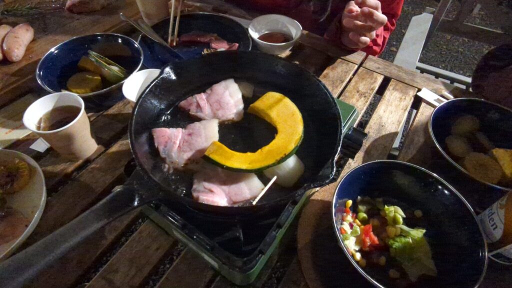 夕食は校庭のBBQ会場へ。こちらのBBQは扱いやすいガスコンロタイプで、分厚い鉄鍋を使って豪快に焼き上げます。