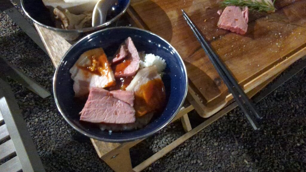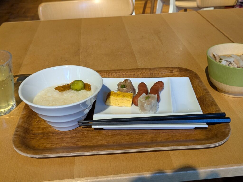 翌朝の朝食は、打って変わってヘルシーな「お粥バイキング」。 数多くの漬物や、出汁の効いた美味しい豚汁が並びます。前日のBBQで疲れた胃に、さっぱりとしたお粥と温かい豚汁が染み渡ります。健康的な朝食をしっかり食べて、清々しい気持ちでチェックアウトを迎えられました。