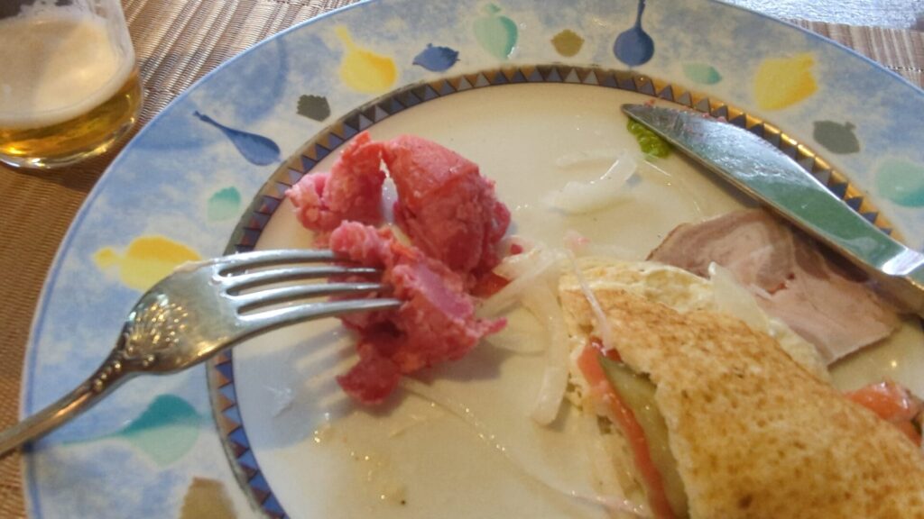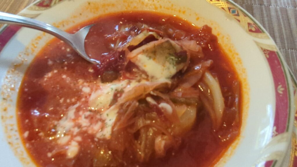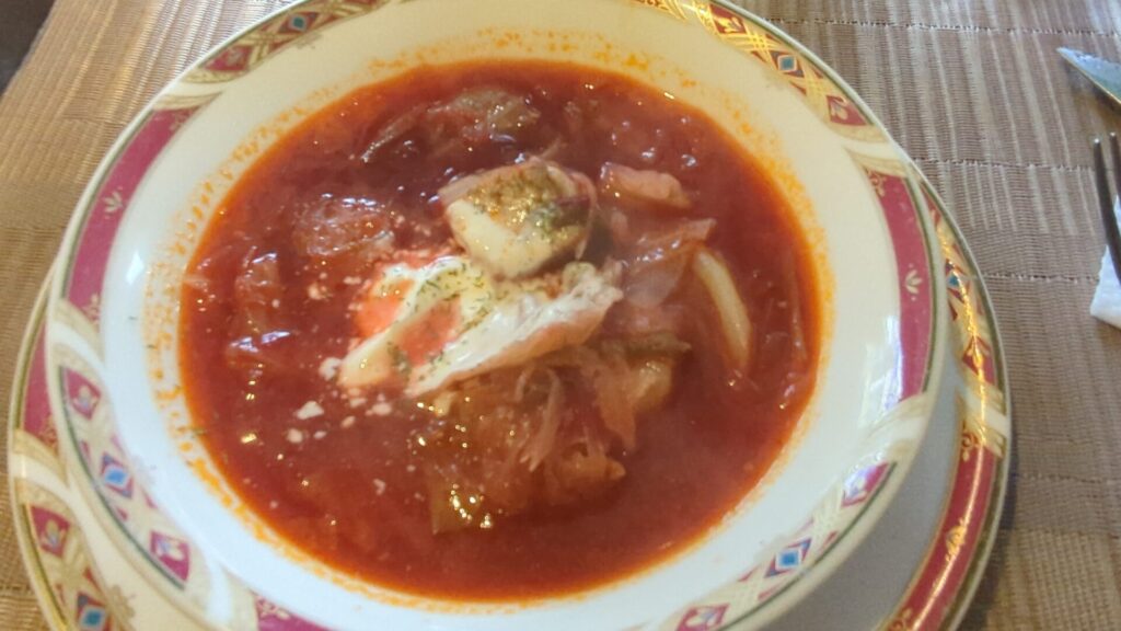 そして、ロシア料理の代名詞といえば「ボルシチ」。 中には野菜やベーコンがゴロゴロと入っており、一口スープを啜れば、素材の旨味がしっかりと溶け出した深い味わいが体に染み渡ります。本格的なボルシチを食べるのはいつ以来だろう・・・。