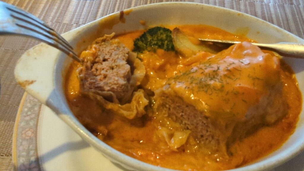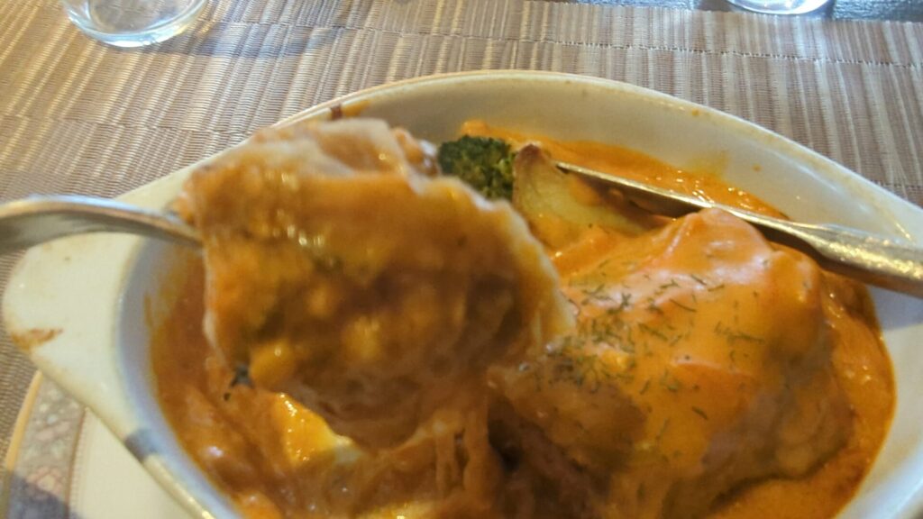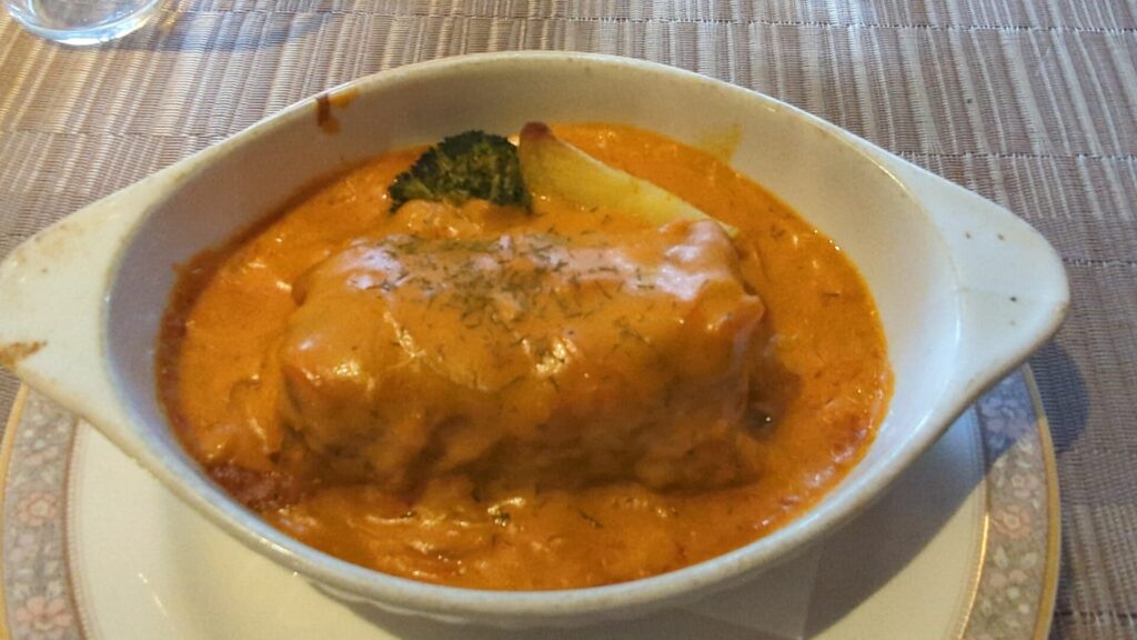 メインディッシュとして登場したのは、ロールキャベツ。 日本の家庭料理で馴染みのあるケチャップ味やコンソメ味を想像していましたが、出てきたのはその予想を良い意味で裏切る一皿でした。