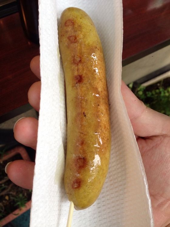 八幡宮を出た私たちは、建長寺方面へと歩き始めます。歩き始めてすぐの場所で、小腹を満たすためにカレー味のウインナーを購入しました。旅の途中のB級グルメもまた楽しい思い出です。
