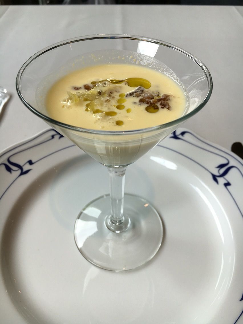 中にコンソメのゼラチンやカボチャを細かくしたものが入っている。適度な塩味の中に、かぼちゃの甘味がでており美味しい。かぼちゃの食感もよい。