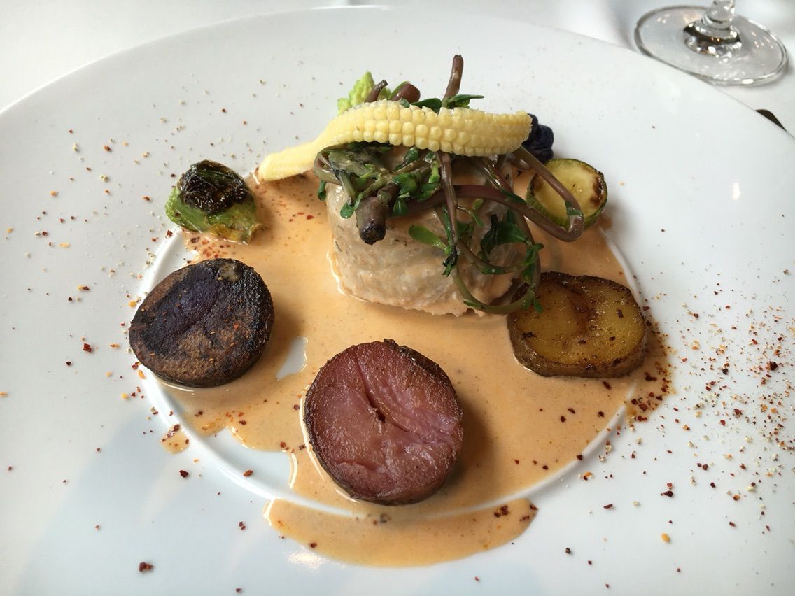 メインディッシュ。ホタテはぷりぷりしており美味しい。ソースをつけ、パンと一緒にホタテを食べるとめっちゃ美味しいです。まわりの野菜もソースとよくあう。