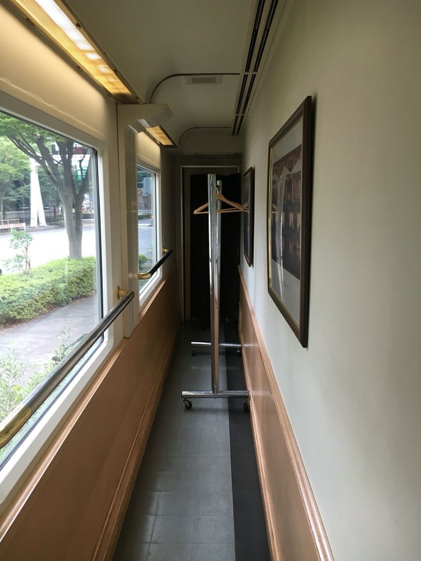 奥の建物の中なので、窓越しには客車と木々が見える。客車が道路を遮っているので、街中なのに、森の中にいる気分になる。セミの鳴き声がさらに森の中にいるように感じさせる。