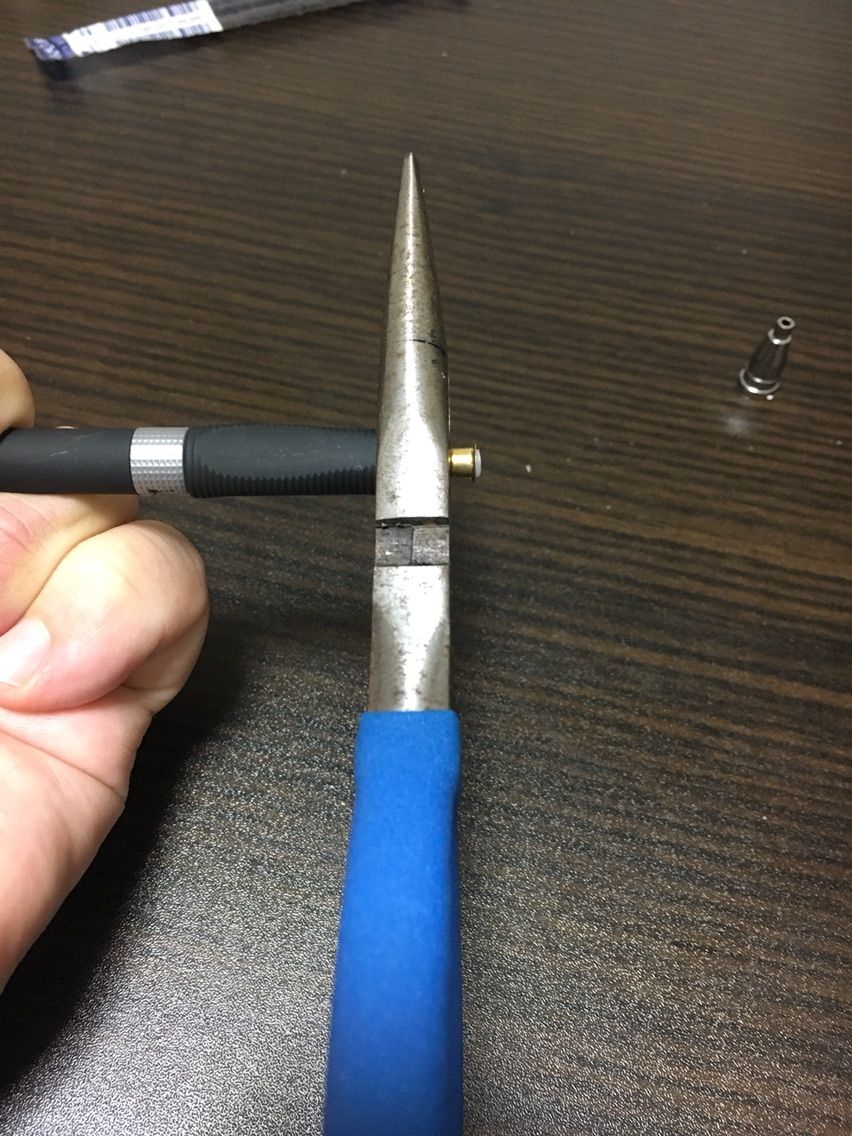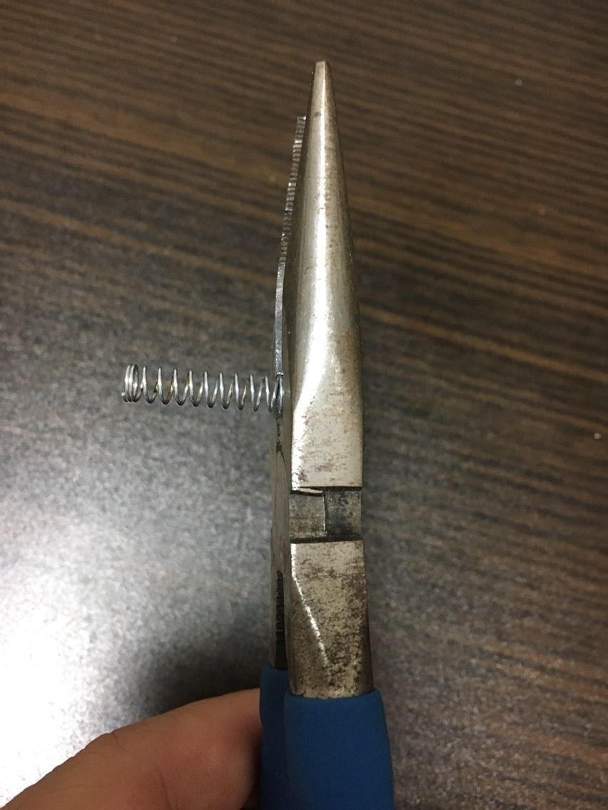 ③そのうえで、バネを慎重にペンチでカット。このバネをそのまま使ってしまうと、気持ちバネの力が強すぎて、ラミーのばねと交換したときに、ノックができない(できたとしてもすぐ引っ込んでしまう)ため、バネをカットする必要が出てくる。