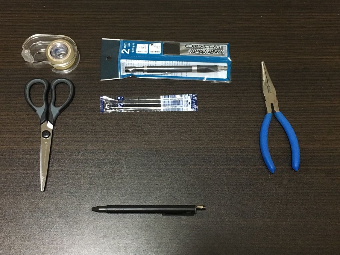 ①まずはバネの作成から。「サンノート株式会社」製の2mmのシャーペンからバネを取り出す。