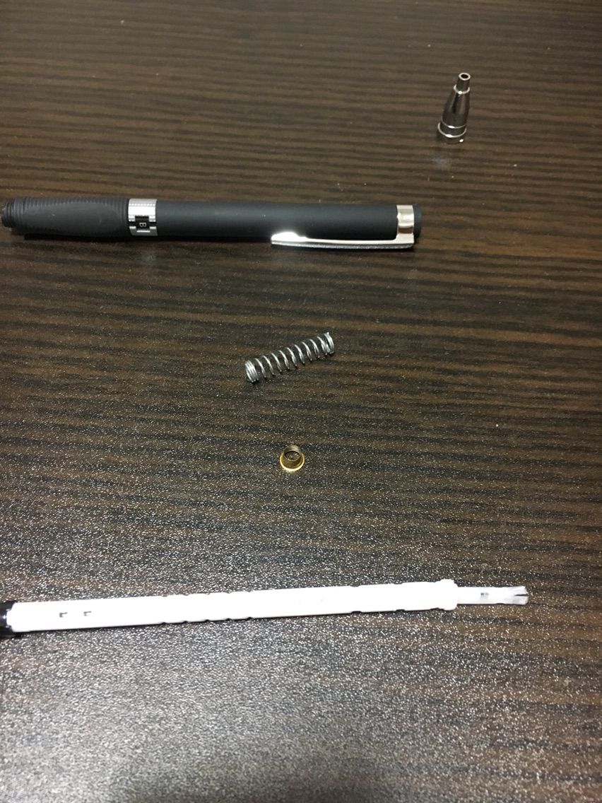 ただしカットしすぎると今度はバネの力が弱くなりすぎるので、慎重に先端から徐々にカットし、ラミーのバネと交換し、ノックの返りを確かめる必要あり。
