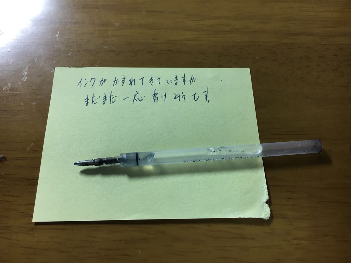 ほぼ最後までインクの出は悪くなく、書き心地もそこまで失われないので、お得。少なくともラミーの正規の芯だともっとなくなるのが早かった気もしますし、なによりラミーの正規の芯は600円くらいするのであまり頻繁には使えないですが、「ゼブラ ジェルボールペン JF0.7」は1本90円弱なので気にせずガンガン使用できます。