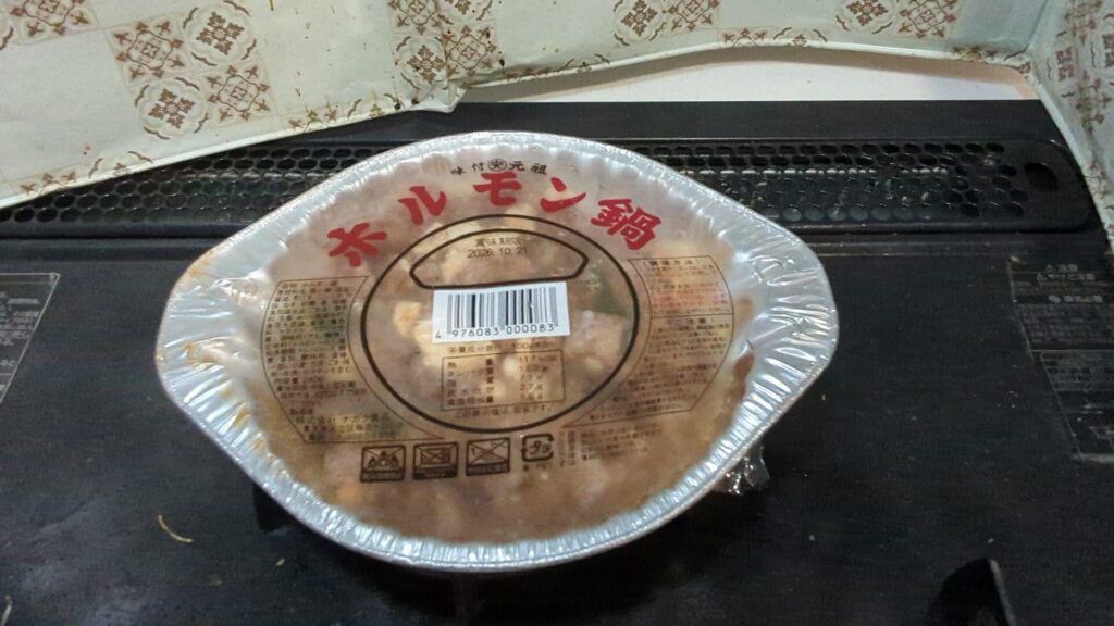 この商品の最大の特徴は、アルミ鍋がそのままセットになっていることです。 パッケージを剥がすと、そこにはカチコチに凍ったホルモンとスープが。これをそのままガスコンロに載せるだけで調理開始。包丁もまな板も、事後の鍋洗いも必要ありません。