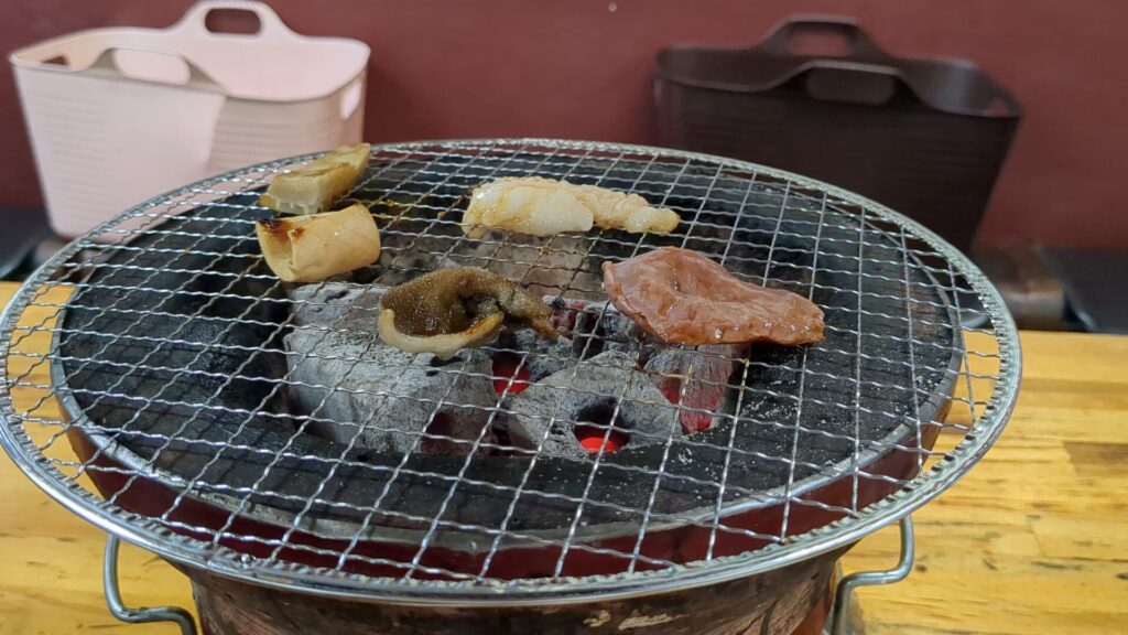 火力が強いので結構すぐに焼けます。ホルモンなので、じっくり焼いて食べる。どんどんお皿に入れていきます。
