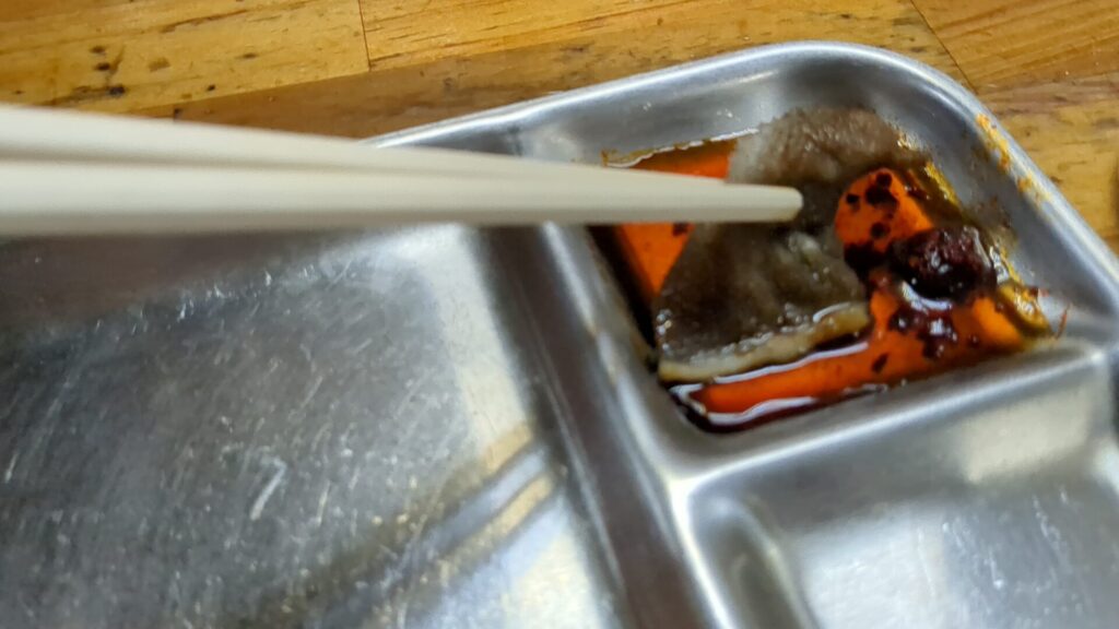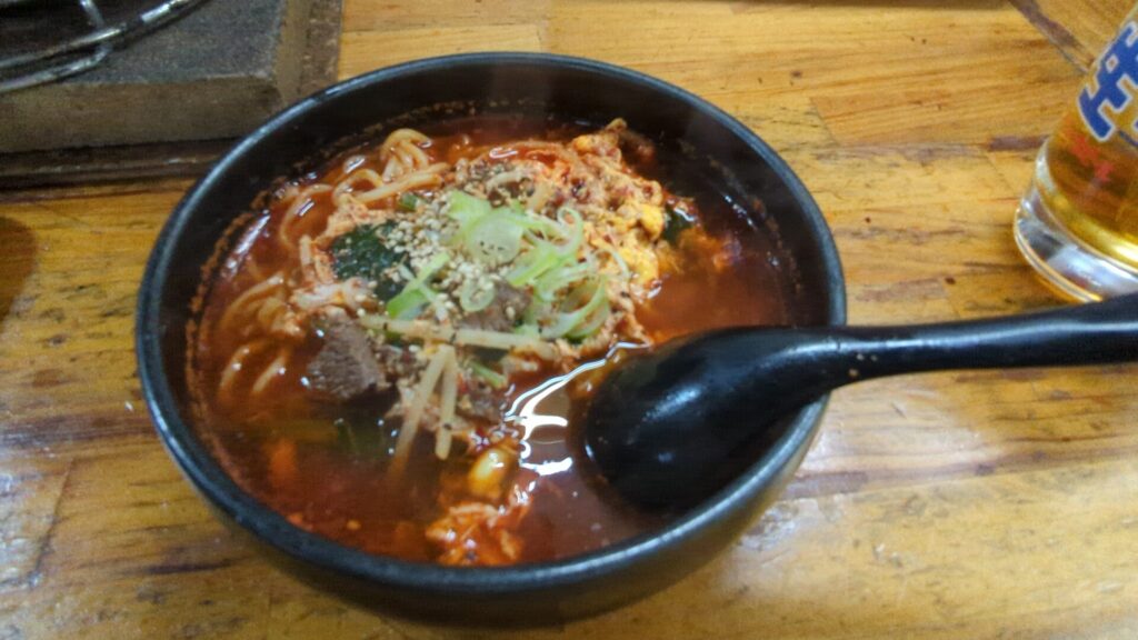 そして、ユッケジャン麺は、ホルモンで満たされた胃に、温かいスープと麺が染み渡り、心地よい満足感を与えてくれました。ピリ辛のスープが、炭火焼きの煙と脂で熱くなった体にちょうど良く、最高の締めくくりとなりました。