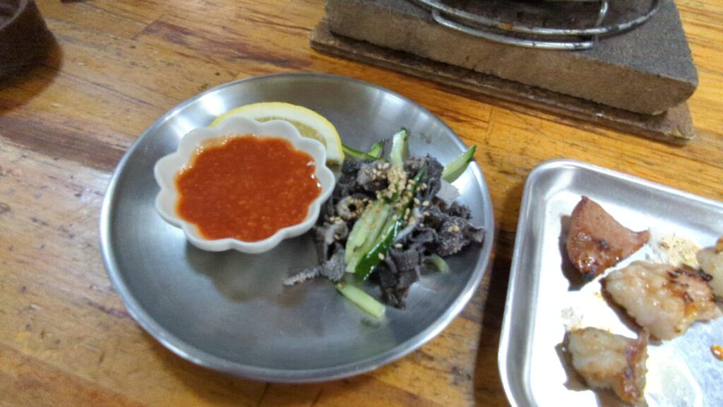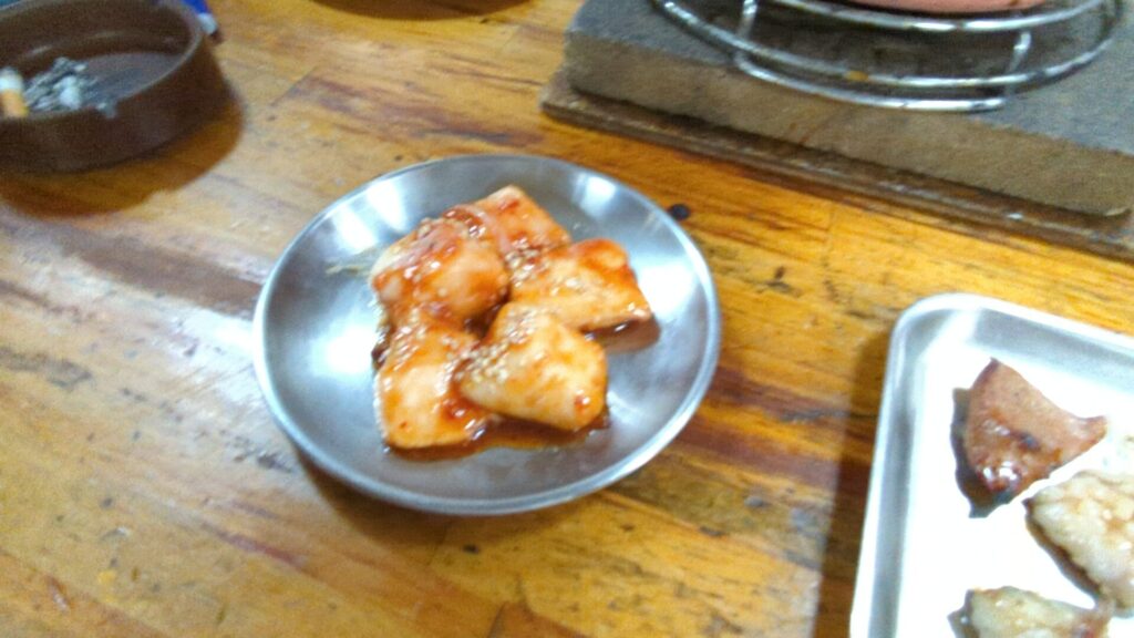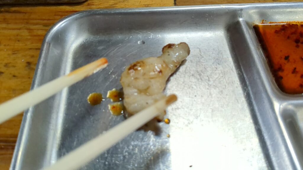 熱々の炭火の上で、マルチョウはコロコロと転がりながら、内部の甘い脂を熱していきます。少し焼きすぎたかな、と焦げてしまった部分もありましたが、むしろこの焦げ目が香ばしさを引き立て、脂の甘味と相まって、逆にたまらなく美味しいのです。外はカリッと、中はとろけるような脂。これぞ、小腸の醍醐味です。