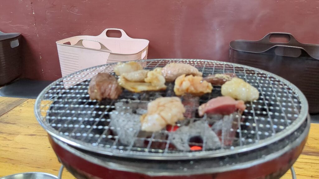 2. 嬉しい「炭火焼き」スタイル 店内に入ると、既に歓迎の儀式が始まっています。一テーブル(一客)ごとに、本格的な炭の焼き台が提供される形式です。炭火の強い火力は、ホルモンを一気に焼き上げ、余分な脂を落とし、香ばしさを閉じ込めます。そして、店内にはホルモン好きにはたまらない、あの「モクモク」とした煙が充満しています。この煙こそが、日々のストレスを浄化してくれる気がするのです。