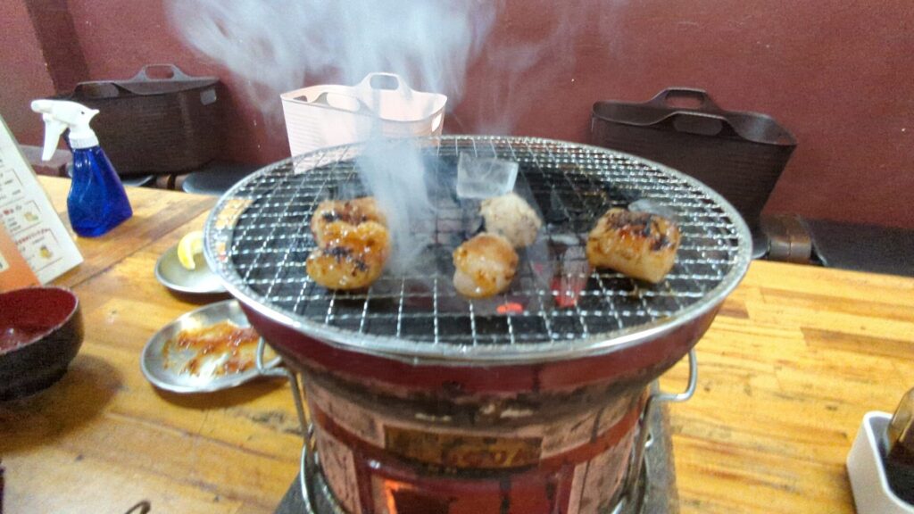 炭火の火力が非常に強く、すぐに焼き上がります。ホルモンはじっくりと焼き上げ、脂が溶け出すタイミングを見計らって口に運びます。
