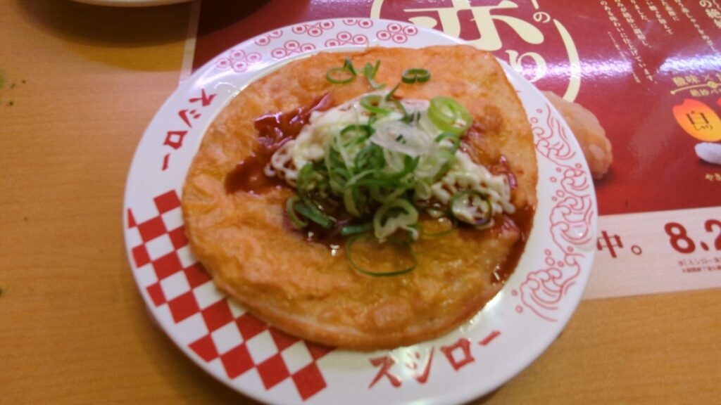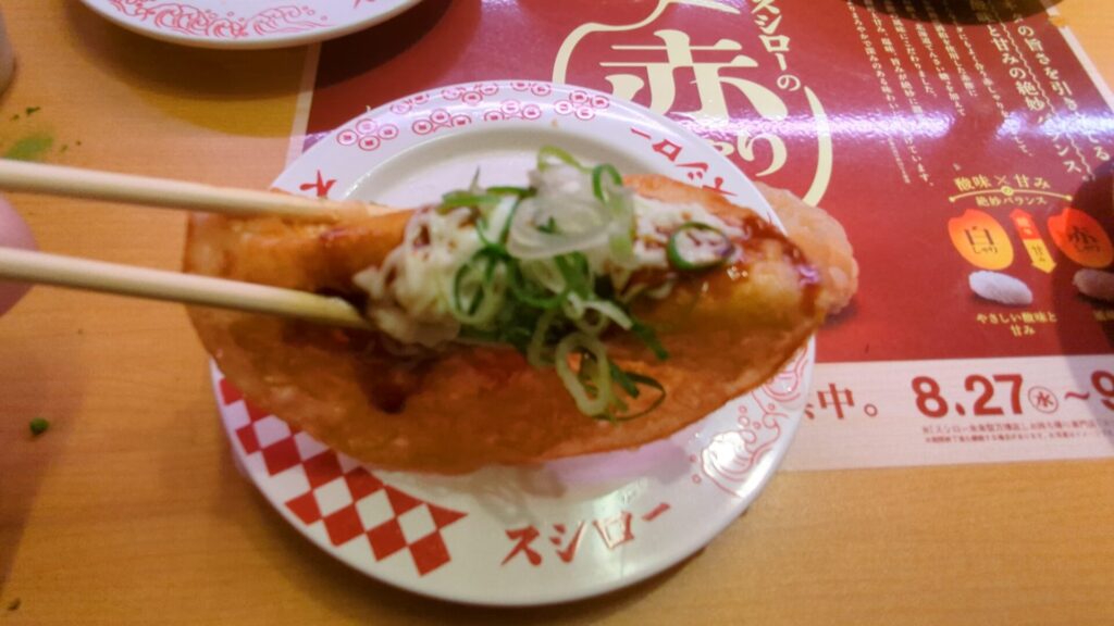 回転寿司の肉メニューの定番ですが、豚バラ肉にチーズと炙りの組み合わせは、やはり間違いなく合います。濃厚なマヨネーズと炙られたチーズの香ばしさが口の中に広がり、至福のひとときでした。罪悪感を感じつつも、ついつい注文してしまう、魅力的なメニューです。