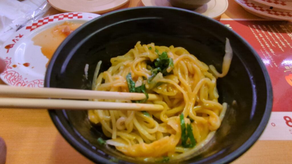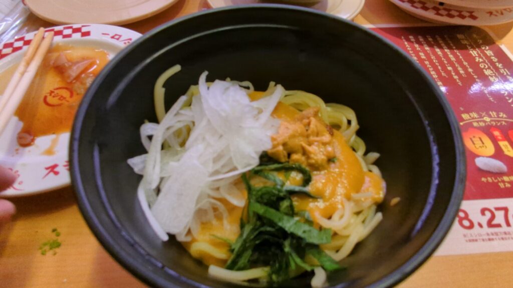 普段は回転寿司で高価格帯のサイドメニューを頼むことはあまりありませんが、この日はどんどん挑戦していきます。スシローでラーメンは食べたことがありましたが、「まぜそば」は初めての体験です。
