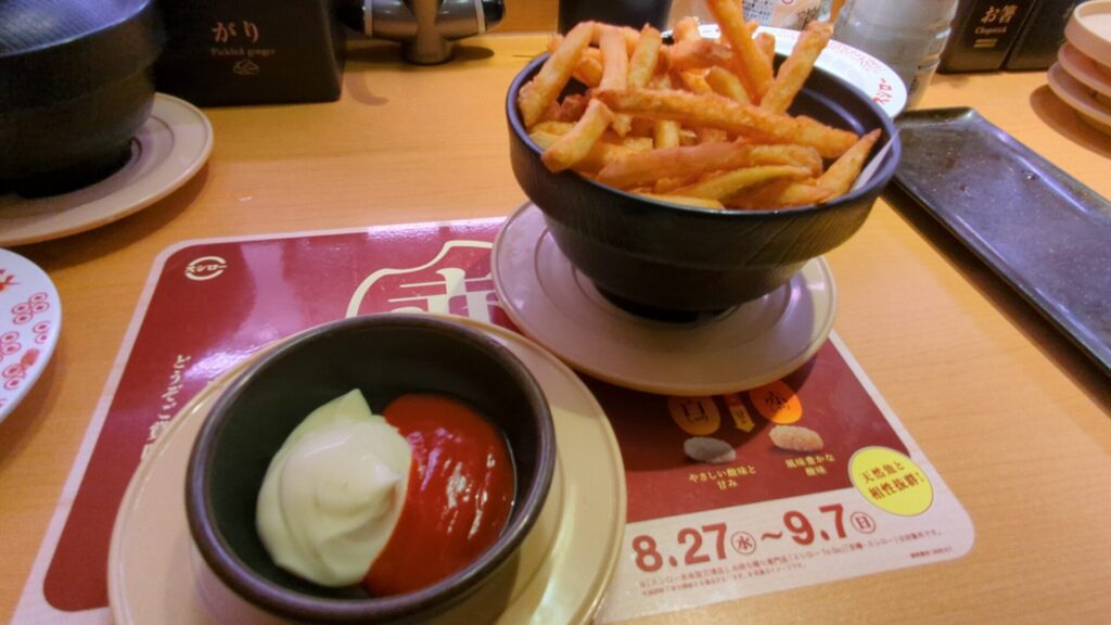 回転寿司のポテトはなぜか中毒性がありますが、一点だけ残念だったのは、ケチャップとマヨネーズが別料金になっていた点です。これも時代の流れなのかもしれませんが、少し悲しく感じました。